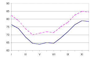 Der Wasserdampfgehalt der Luft wirkt sich auf Bewölkung und Niederschlag aus. Die Luftfeuchtigkeit ist von der Temperatur direkt abhängig und erreicht aus diesem Grund im Winter ihr Maximum, während sie von April bis Juli am geringsten ist. Die Feuchtigkeitsunterschiede zu den anderen Stationen sind wie die Temperaturunterschiede im Sommer und Winter am größten.